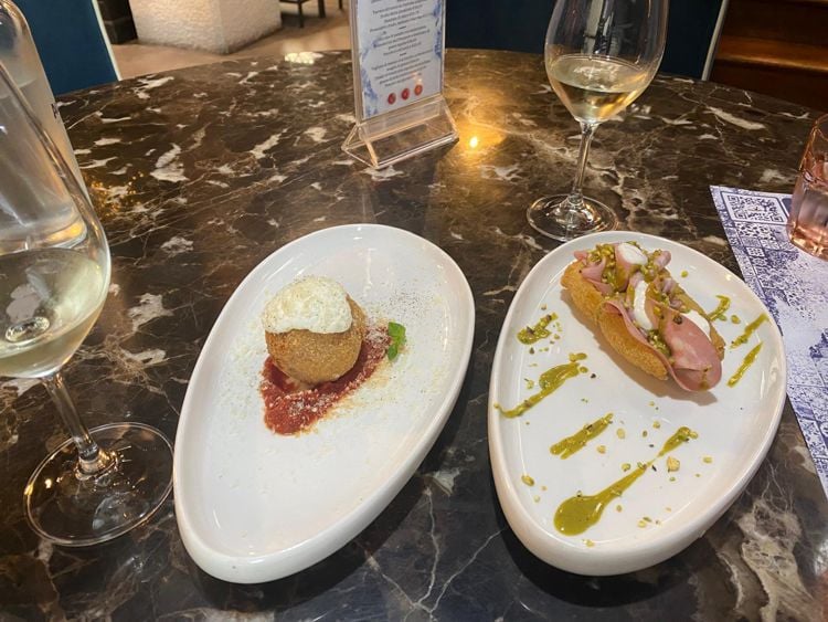 Già dagli antipasti si capisce la qualità della cucina e la volontà di offrire agli ospiti prodotti gustosi in grado di fare rivivere al cliente il piacere della tradizione gastronomica partenopea. Ci sono state servite le tradizionali fritture partenopee con un tocco in più di modernità: in tavola una Palla di riso al ragù con piselli, stracciatella e pepe, un Crocchè napoletano con mortadella, pistacchio e stracciatella e una Frittatina classica con stracciatella, piselli e besciamella.