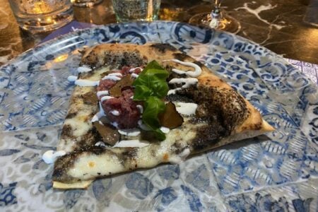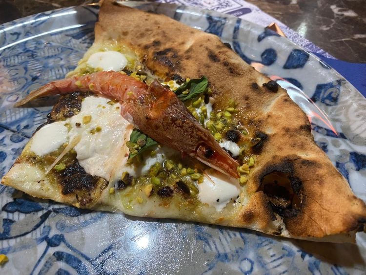 A seguire, un altro piatto particolarmente interessante: una Pizza gourmet ovviamente con l’immancabile cornicione, con gambero rosso di Mazara del Vallo arricchito da pistacchio. Un mix perfetto tra i sapori del marinari e quelli della tradizionale pizza napoletana. Dal mare siamo passati poi alla terra: in tavola una favolosa Pizza con tartare di Fassona e tartufo.