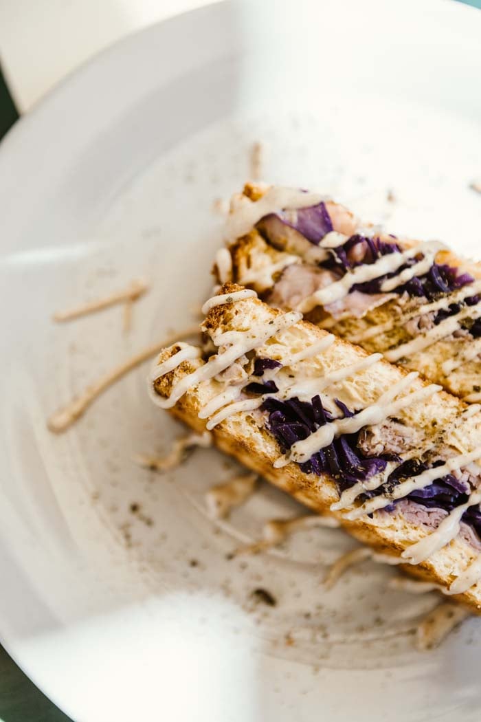 Il “vitello tostato” con pan brioche è esaltato dal cavolo rosso crudo per un sicuro piacere del palato.