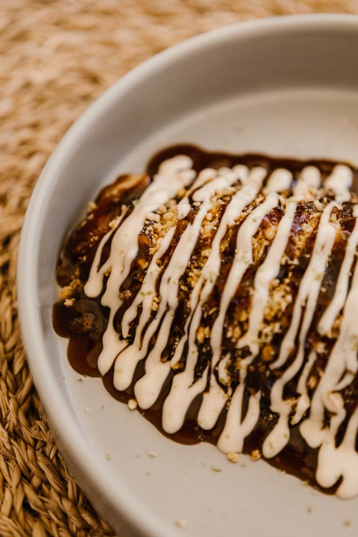 Il petto di pollo, marinato per due giorni e cotto a bassa temperatura, viene proposto con salsa yakitori, maionese alla soia, panure croccante e scorzetta di lime: un piatto deciso e appagante.