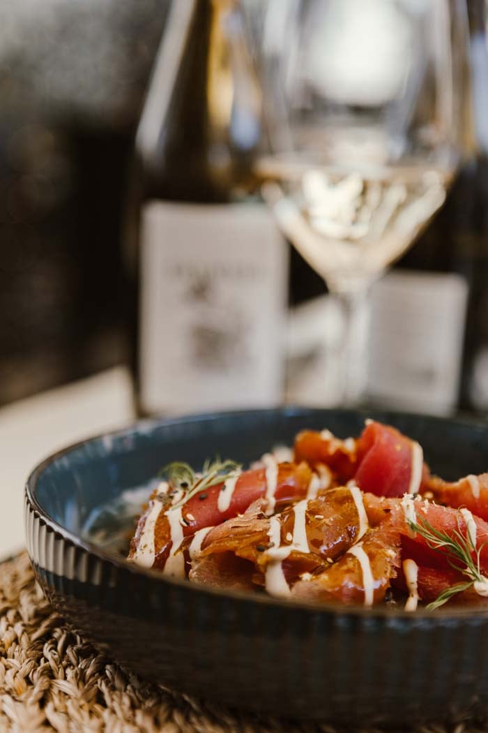 Tra i piatti principali, il carpaccio di tonno rosso marinato con fondo bruno, servito su un letto di spinacino e completato da aneto, maionese all’acciuga e semi di sesamo, si distingue per il perfetto equilibrio tra pesce e verdura.