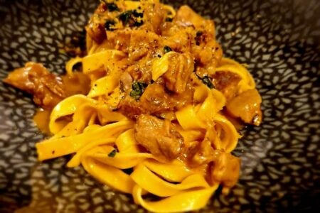 È un calice di Franciacorta l’abbinamento che Mirko sceglie per il nostro antipasto, un Tagliere misto composto da coppa, pancetta Giovanna, culaccia e salame della Valtènesi insieme a tomino in crosta, frittatina classica, polpettine di carne al sugo, cipolle in agrodolce e l’assaggio più sorprendente di tutti: castagne avvolte nel guanciale croccante.