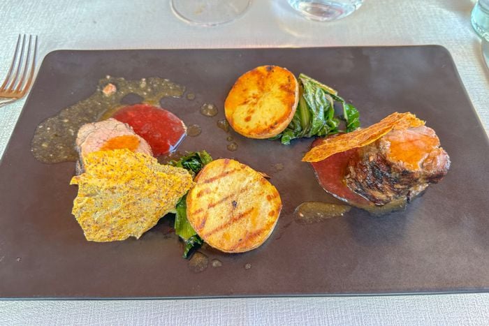 Ardua è stata la scelta dei secondi piatti, dove le carni fanno da padrone. Noi abbiamo optato per un Filetto di maialino alla brace e un Filetto di manzo – anch’esso alla brace – con fonduta di bagoss e indivia belga. Entrambi i piatti erano ottimi e impiattati in modo elegante. La carne era tenera, ben cotta e accompagnata da ottime verdure che, ove possibile provengono dalla loro piccola produzione, oppure dai fornitori delle zone limitrofe.