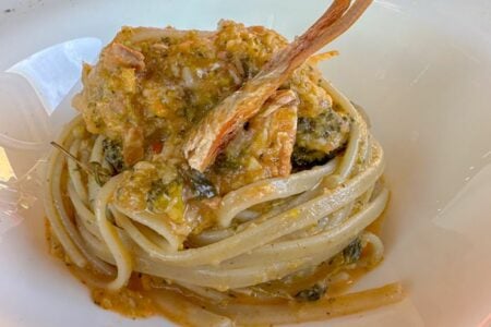 A seguire abbiamo assaggiato le paste fatte in casa degustando delle Tagliatelle al salmì d’asina e delle Linguine con sarde, broccoli e bottarga. Al palato è stato piacevolissimo ritrovare la consistenza e la qualità della pasta fresca e la squisitezza di quei sughi di una volta, ma con un impiattamento più moderno ed elegante, seppur perfettamente consono alla trattoria.