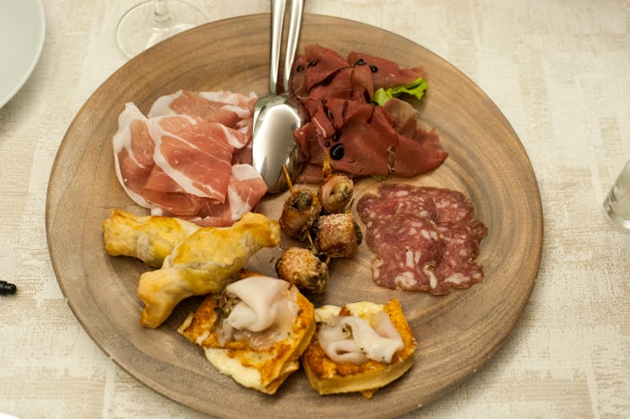Come da tradizione bresciana il Piatto dell’Antipasto apre la nostra degustazione, in una giostra di assaggi di qualità: salame nostrano e prosciutto dolce di Parma con caramella di sfoglie, carne salata con lumache al bacon e formaggio nostrano alla piastra con lardo. Un piatto che rimanda alle tavolate di un tempo, ai banchetti famigliari e alla riscoperta di gusti che hanno sempre fatto la brescianità gastronomica.