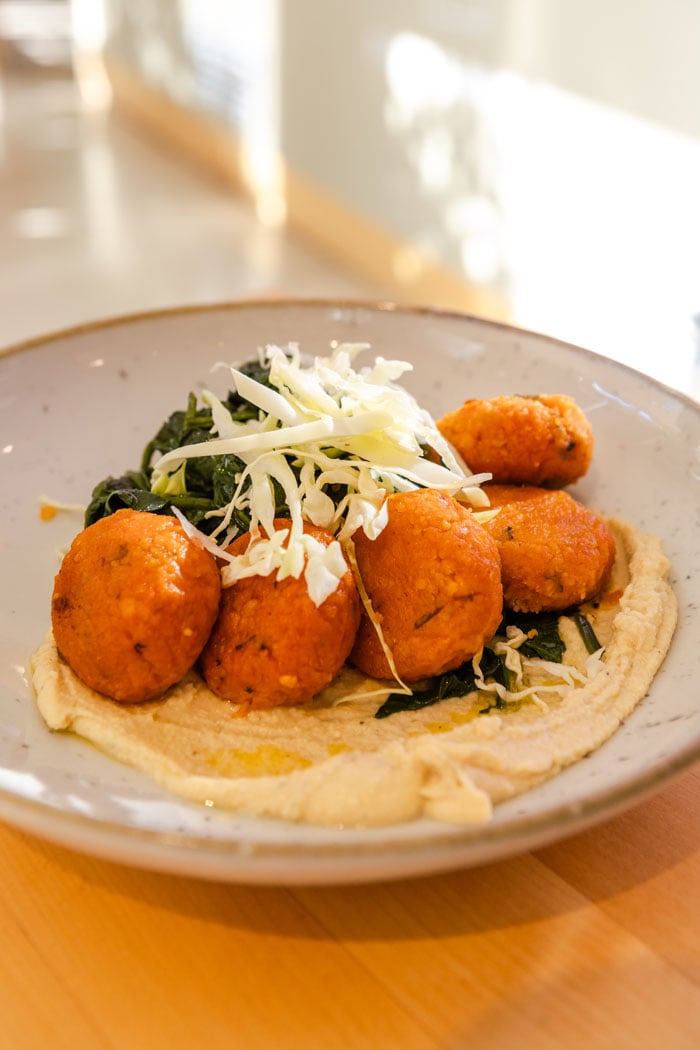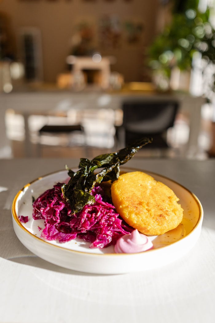 Oggi il piatto del giorno è una farinata di ceci, ma ci viene proposto di esplorare due delle proposte più rappresentative della casa. Le polpettine di lenticchie rosse e miglio, servite con cavolo rosso saltato, un paio di chips di cavolo nero e maionese rosa alla barbabietola, conquistano per la loro armonia: morbide, profumate, delicate, con una speziatura leggera che scalda il palato senza sovrastarlo, mentre la maionese aggiunge freschezza e continuità.