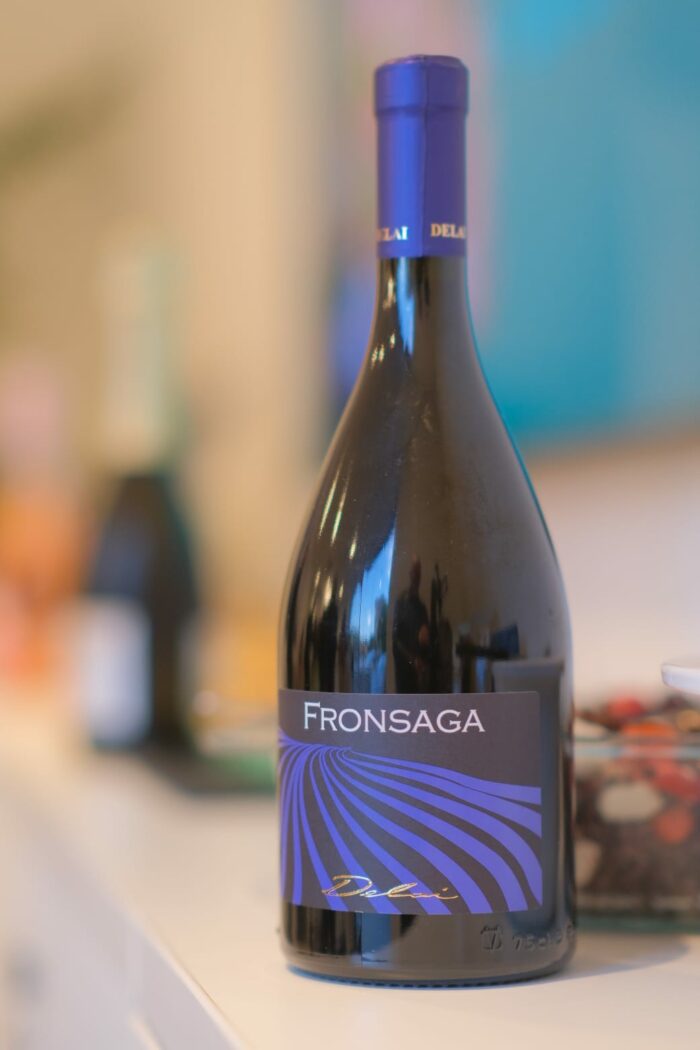 Viriamo verso il rosso con un Fronsaga (la denominazione corretta è Benaco Bresciano Rosso IGT) che ha come uvaggio Merlot (85%) – Barbera e Rebo (15%) dove il Barbera non è vitigno usuale, è stata necessaria grande maestria, una vendemmia tardiva, l’appassimento ai venti del lago e una sapiente maturazione in piccole barriques di rovere francese. Un vino corposo e strutturato che rivela un profilo aromatico complesso ed equilibrato, dove le note terrose sono armoniosamente bilanciate da quelle speziate e dolci del cacao e della confettura di prugne e ciliegie.