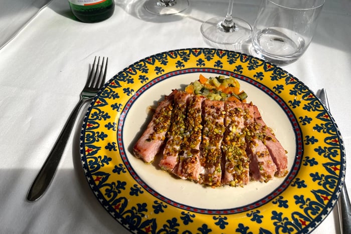 Oltre alle ricette della loro famiglia e piatti tpici del territorio, Il Glicine propone anche piatti di pesce. Il piatto forte è la tagliata di tonno in crosta di pistacchi con verdurine al profumo di porro, piatto gettonato e simbolo del ristorante che racchiude in un solo morso l’eleganza del tonno fresco e l’intensità croccante dei pistacchi, il tutto avvolto dalle verdure saltate. È un piatto che rappresenta la filosofia de Il Glicine: semplicità, qualità e quel tocco di creavità che rende ogni