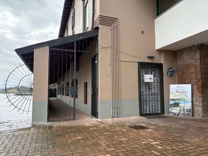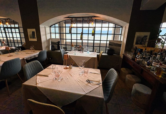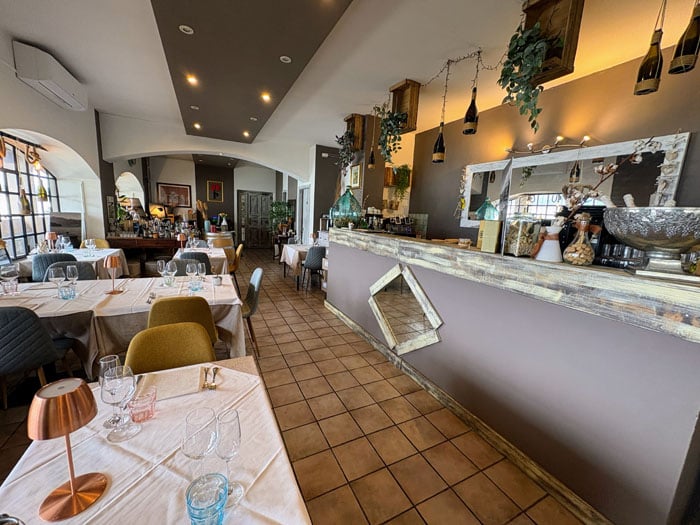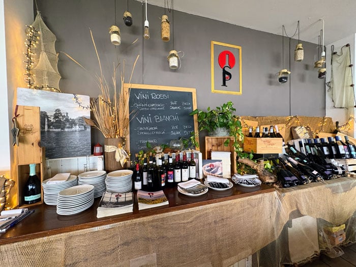 L’osteria è ricavata al piano terra della Corte Filanda Pirola, tra il porticciolo di Clusane e lo storico imbarcadero: una posizione appartata, forse poco nota a chi passa dalla strada principale, ma capace di sorprendere non appena la si scopre. Da una vecchia filanda degli anni ’60, è nato un ambiente che conserva suggestioni artigiane e atmosfere di lago, reinventate con gusto contemporaneo: ampie vetrate in piombo a quadrotti, botti e cassette di legno a fare da scenografia, reti e corde da pesca con lampadine sospese lungo i muri, bottiglie e barattoli appesi come cimeli di una memoria collettiva. Piccole abat-jour su ogni tavolo creano intimità, mentre tovaglie chiare e bicchieri assortiti aggiungono un tocco di raffinatezza informale.