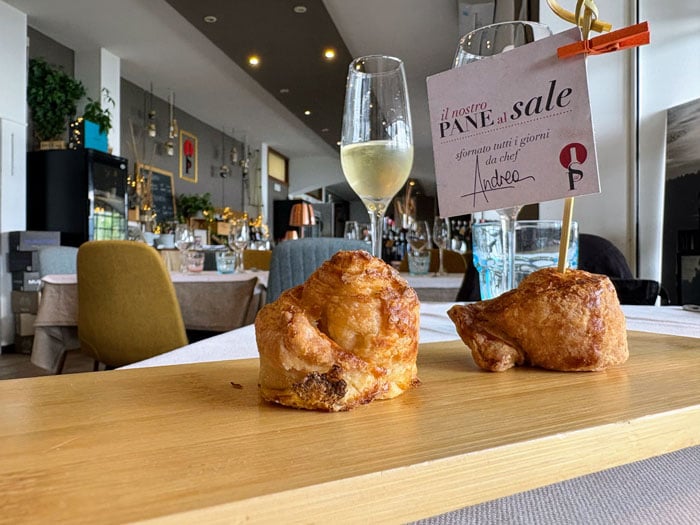 Il pane omonimo, il “pane al sale” fatto in casa, viene sfornato fresco ogni giorno ed è certamente uno degli assi della cucina: crosta croccante, cuore soffice e sfogliato, arricchito da pregiato burro di alta qualità e cristalli di sale che ne bilanciano la dolcezza, davvero irresistibile. In accompagnamento, un cestino con pane tradizionale e pane carasau all’origano offre variazioni di consistenza ben studiate.