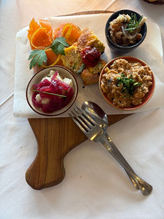 Il tagliere del lago “Il giusto” (versione per due) è una piccola mappa del territorio: crostini al burro con trota affumicata e lime, flan di verdure e pesce di lago, luccio al vapore con cipolla caramellata e olio di Marone, morbida polentina con ragù di lago e “aoline” in carpione, piccoli pesciolini marinati e fritti con cipolla e uvetta. Sapori decisi, ma misurati: ogni elemento mantiene la propria personalità senza sovrastare gli altri.