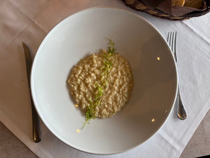 Il risotto al Franciacorta Brut DOCG, profumato al lime, è il momento «wow» del pranzo: crema al Franciacorta frullata con scalogno, un tocco di panna e una mantecatura abbondante di Grana Padano avvolgono un Carnaroli tostato e cotto al punto giusto. La scorza di lime grattugiata in finale dona, oltre che artisticità al piatto, freschezza e profumo: equilibrio perfetto tra cremosità e leggerezza.