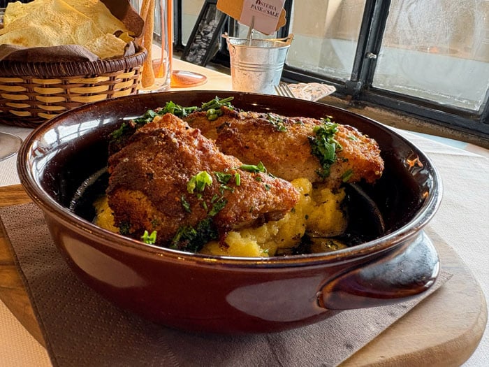 Segue la tinca alla clusanese, piatto simbolo del luogo, che arriva in una terrina generosa: tranci non diliscati farciti con pangrattato, Grana, aromi e spezie, cotti lentamente nel burro fino a diventare dorati e succulenti. Tradizionalmente servita con polenta morbida, qui la porzione è davvero abbondante: nella formula degustazione sarebbe ideale una versione più contenuta, per poterla apprezzare fino all’ultimo in tutta la sua genuinità.