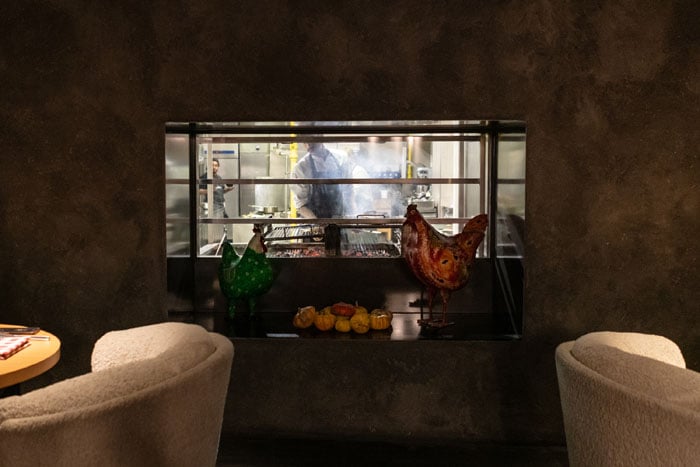 Il fuoco è il suo elemento guida, protagonista silenzioso di una cucina che unisce tecnica e identità. La grande griglia a vista, che separa una delle quattro sale dalla cucina, è un palcoscenico di gesti precisi: cinque giovani cuochi si muovono in perfetta sintonia tra brace e padelle, in un’atmosfera intima e vibrante.