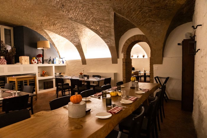 Ultimo arrivato del gruppo Terre Moretti, il Quintale è un raffinato equilibrio tra ricerca e semplicità: pavimento in cotto tipico delle cascine, punti luce studiati per creare atmosfere raccolte ma che non distraggono dal piatto, centrotavola essenziali e curati — in questo periodo simpatiche zucchette — e un servizio impeccabile ma mai rigido.