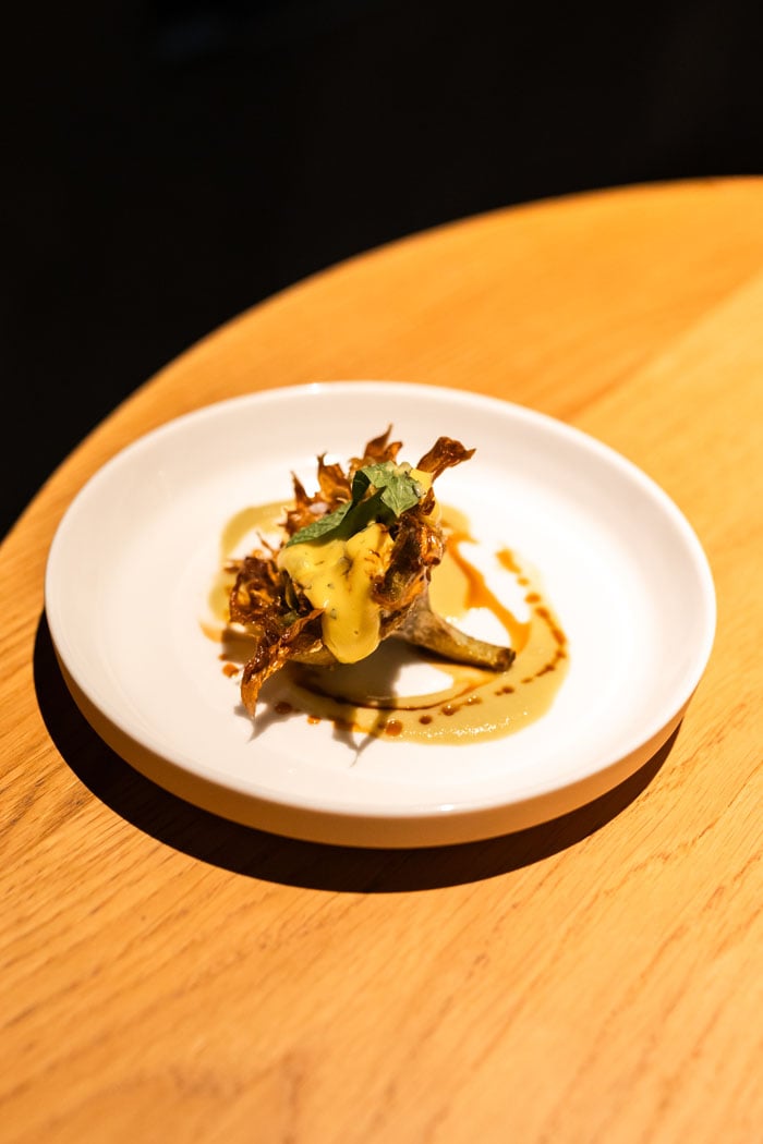 Poi un carciofo fritto con béarnaise alla menta, croccante all’esterno e succoso al cuore, aromatico e leggero.