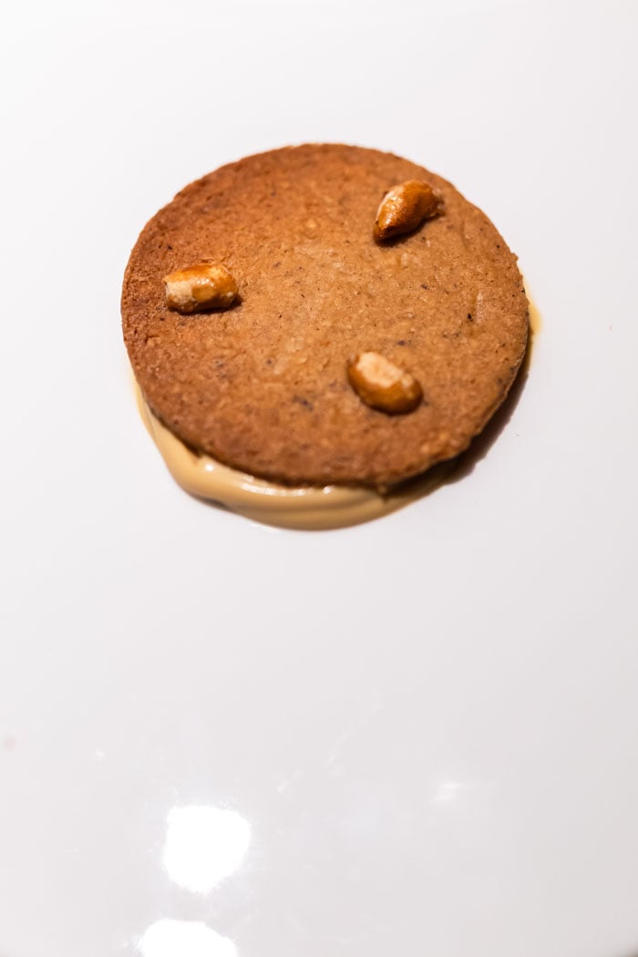 Il dessert, ultima creazione dello chef, è un gioco di dolcezza e acidità: un sablé con crema di dulce de leche e frutto della passione, completato da granella di nocciola per croccantezza e ritmo. Un finale calibrato e goloso.