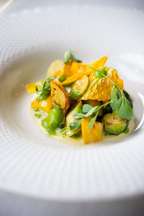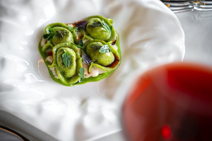 Per chi invece desidera un’immersione nei sapori della terra, il raviolo ripieno di fagioli della Valvestino con erbe spontanee e spuma al fieno rappresenta l’apice della creatività.