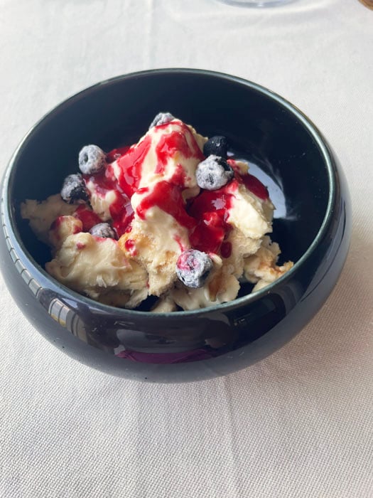 E poi, l‘irresistibile dolce finale: una meringa gelato con salsa ai lamponi, che gioca su consistenze leggere e fresche, un contrasto perfetto tra la croccantezza della meringa e la cremosità del gelato. Ma la vera sorpresa arriva con le olive sabbiate (candite), che racchiudono in un piccolo boccone una vera e propria esplosione di dolcezza, con una nota un po’ salata che le rende ancora più intriganti. Un finale spettacolare, che lascia il palato pienamente soddisfatto, ma anche curiosamente affamato di nuove scoperte.