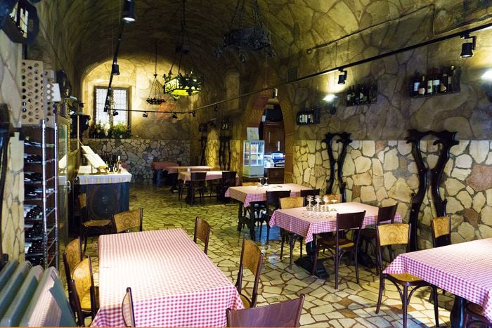 Un locale carico di storia, all’interno di un ambiente ospitale ed incantevole. Due le sale principali: l’antica Grotta, la più affascinante del ristorante – il cui tratto distintivo sono le volte dipinte, i pavimenti e i tavoli originali – risalente al 1942, anno di apertura del ristorante e l’osteria, dove vero protagonista è il bancone di mescita circondato da pareti affrescate con scene di vita contadina.