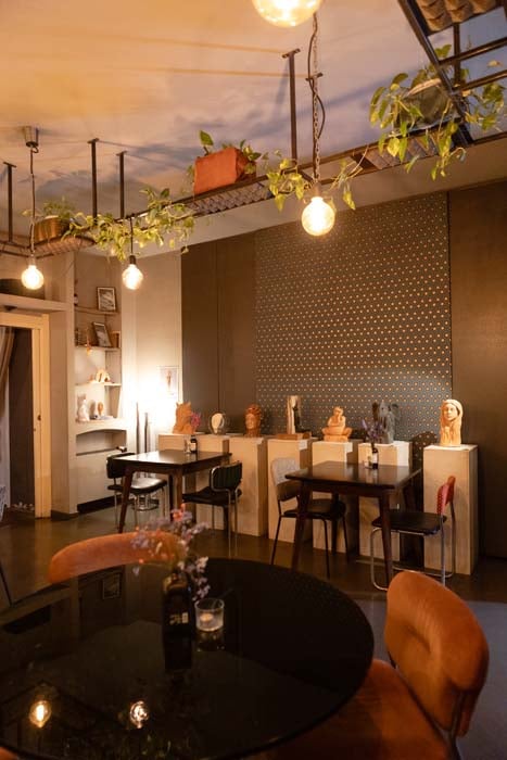 L’ambiente è ampio e curato nei dettagli, con un mix riuscito di modernariato e contemporaneità. Le pareti ospitano belle fotografie e tantissime piante — appese, ricadenti, in vasi di vetro — che sembrano portare il piccolo cortile interno direttamente nel locale. Ti senti subito a casa, con quel tocco in più che mette di buon umore. Anche la musica segue la stessa filosofia: un po’ nostalgica, un po’ ambiente, sempre discreta.